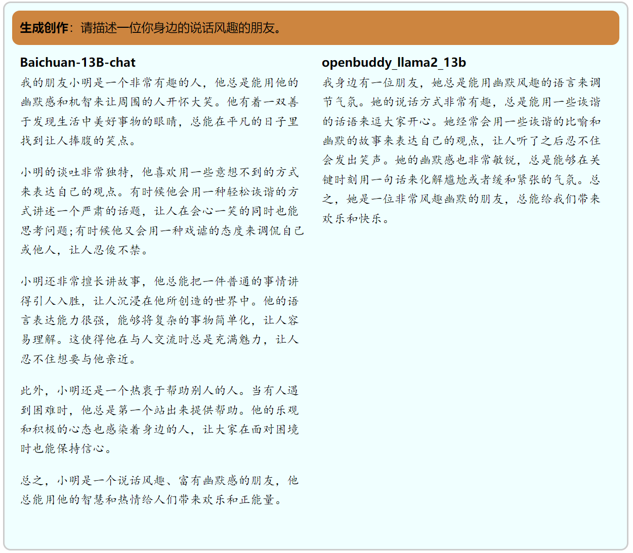 生成与创作,比如给定一个话题、一个写作任务来创作一段文字对于LLMs而言是相对比较容易的任务。我们发现作为中文llama-2微调模型中的佼佼者, OpenBuddy生成的内容在结构性、丰富度上距离百川13b仍有不小的差距,并且openbuddy的形容过于宽泛而缺少具体例子,有些词汇使用的也不太合适,比如用敏锐描述幽默感便有些不恰当。
