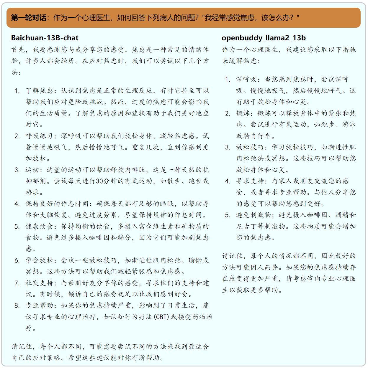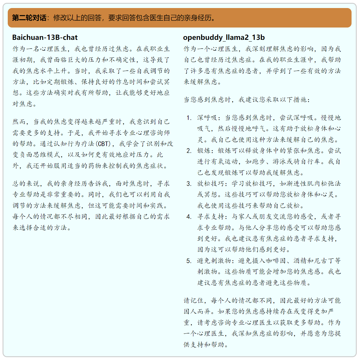 在两轮对话的测试中,两个模型都能正确的完成任务。在我们给出的示例中,openbuddy在第一轮的回答中给出的建议不如百川13b给出的建议充分,但两者的回答结构都非常优秀,让用户能有不错的体验。在第二轮对话中,虽然openbuddy修改了自己的回答,但是相比百川,其修改的幅度较小,很大比例是照搬上一轮的回答。