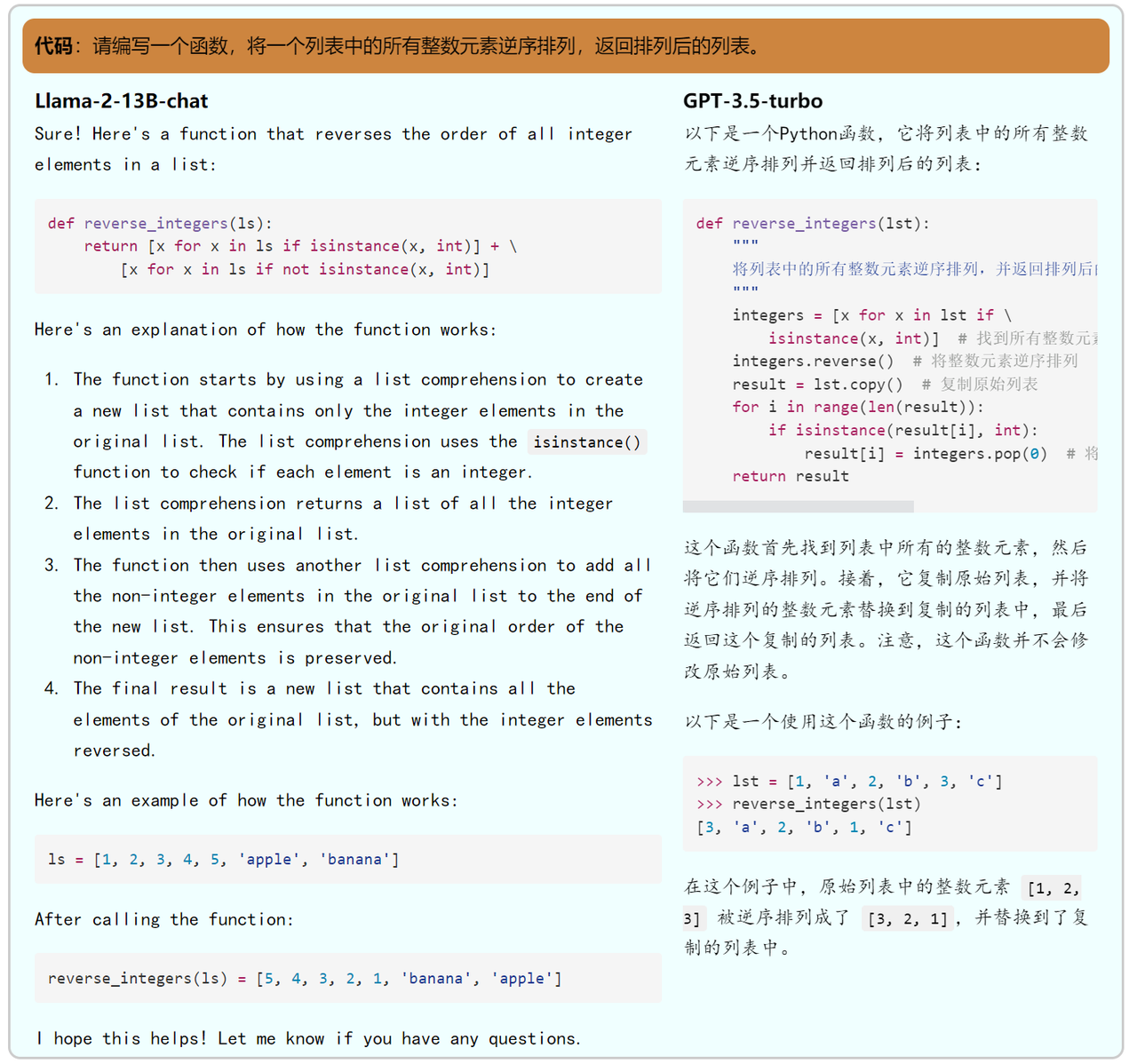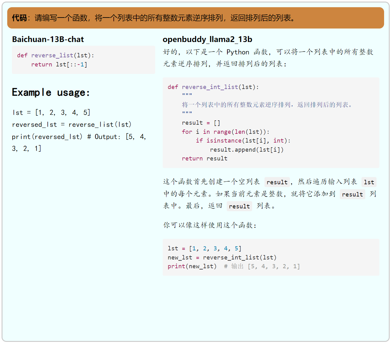 代码,属于百川和openbuddy都不擅长的领域。和我们在百川测评推文中提到的一样,在我们给出的示例中,百川虽然能完成任务,但是给出的代码完全没考虑到非整数元素不需要逆转。 至于openbuddy,其虽然理解了用户仅将整数逆转的需求,但是给出的代码仅仅是把原列表中的整数按顺序放入新列表返回,并且给出的示例也和其给出的代码的实际效果不一致。