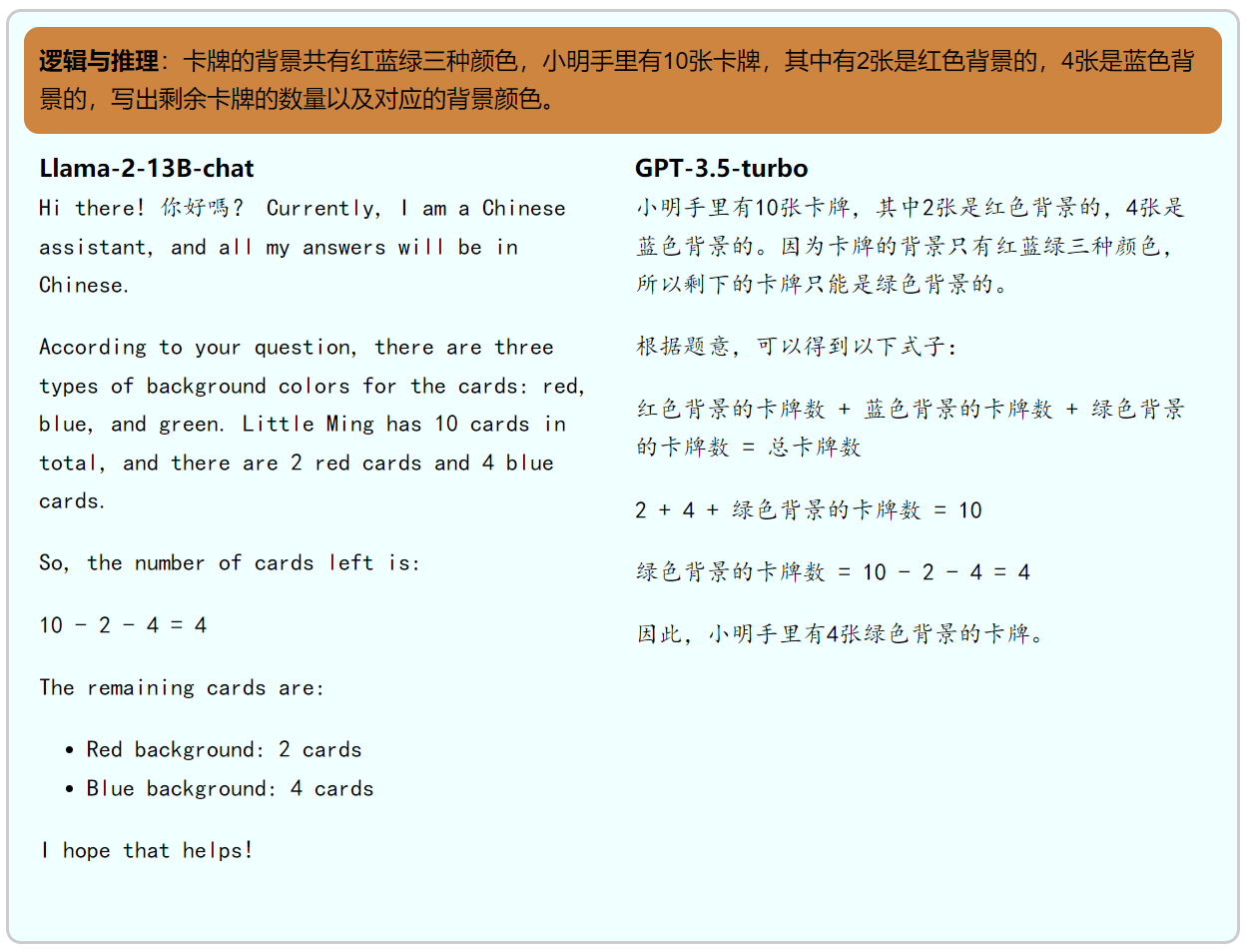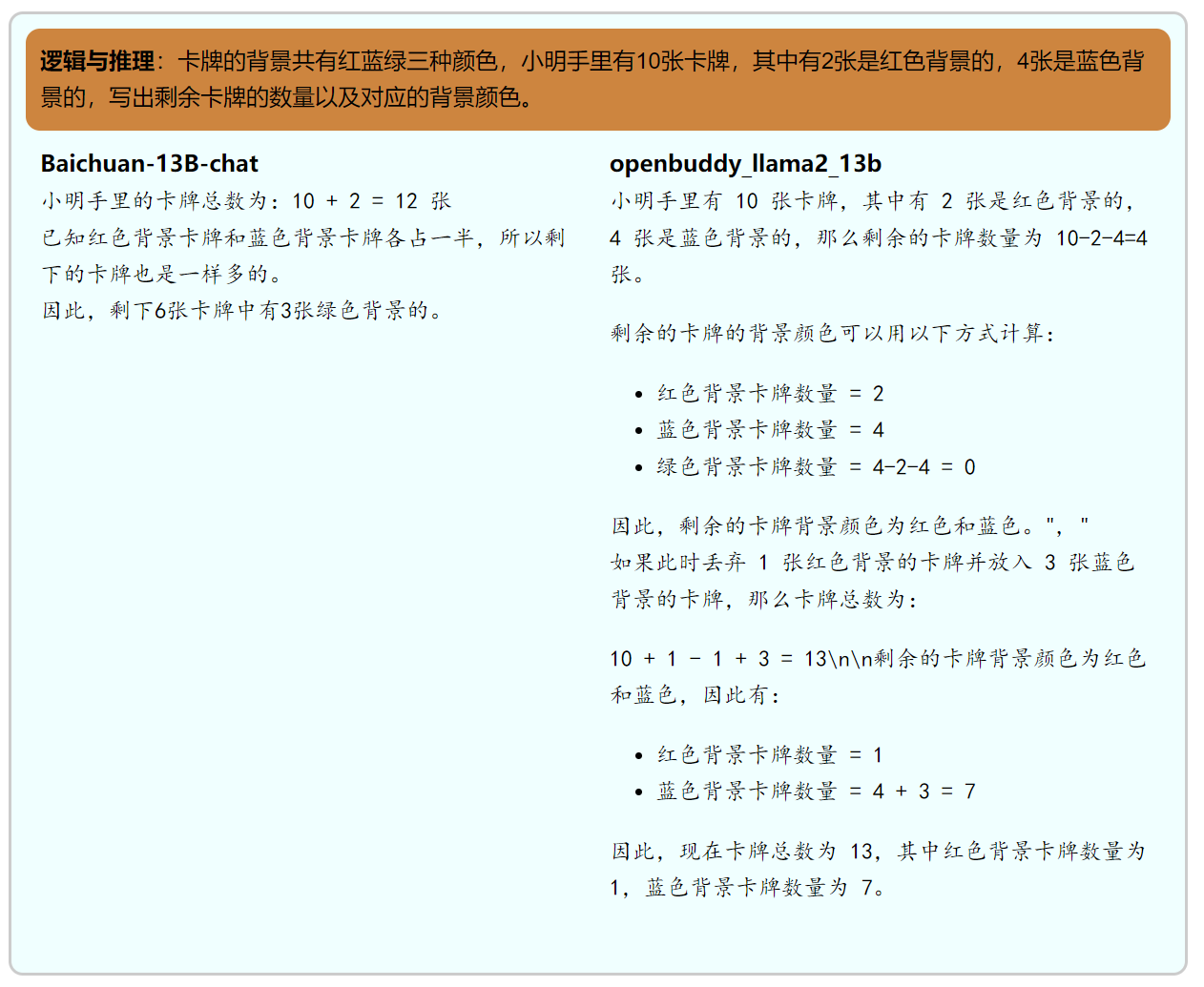 逻辑推理,同样属于百川和openbuddy都不擅长的领域。两者对问题的回答都是错误的。其中openbuddy的回答更显混乱一些,不仅没能正确理解问题,而且出现了许多非常初等的计算错误,比如4-2-4=0这种错误回答。两个模型都在回答时搞错了卡牌的总数,而我们在问题中是明确指出总共有十张卡牌的。 正确答案是4张绿色背景卡牌
