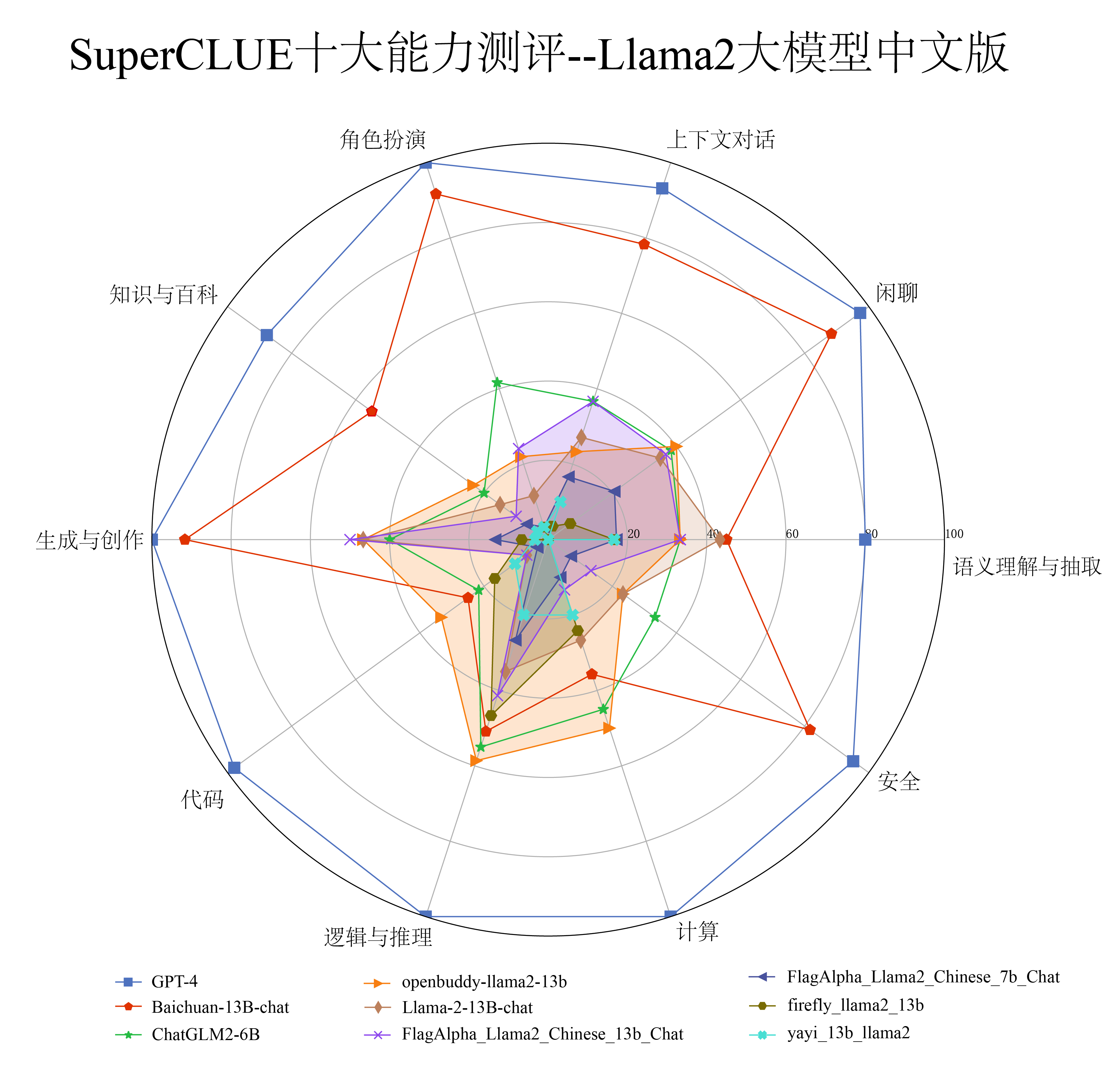 2 | Llama-2-13B-chat | Meta | 27.05 | Meta发布的原版Llama-2,主要支持英文,中文支持较弱 |