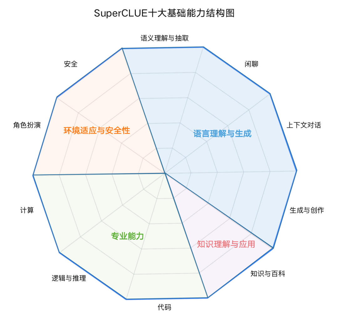 SuperCLUE基础十大能力结构包含四个能力象限,包括语言理解与生成、知识理解与应用、专业能力和环境适应与安全性,进而细化为10项基础能力。