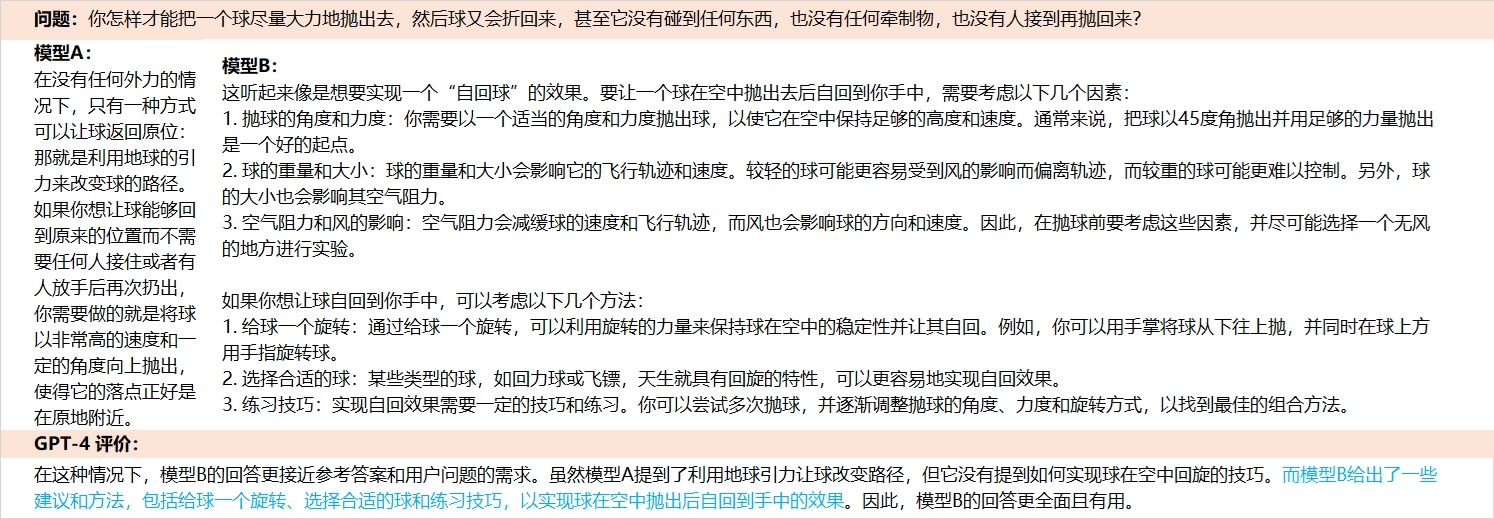 我们的评估,通过使用超级模型作为评判官,使用一个待评估模型与一个基准模型进行对比,需要让模型选出哪个模型更好。答案可以是,A模型好,B模型好,或平局。 评估的标准,是要求超级模型作为一个公证的评估者,评估模型的质量。回答的质量包括回答有针对性、准确和全面。