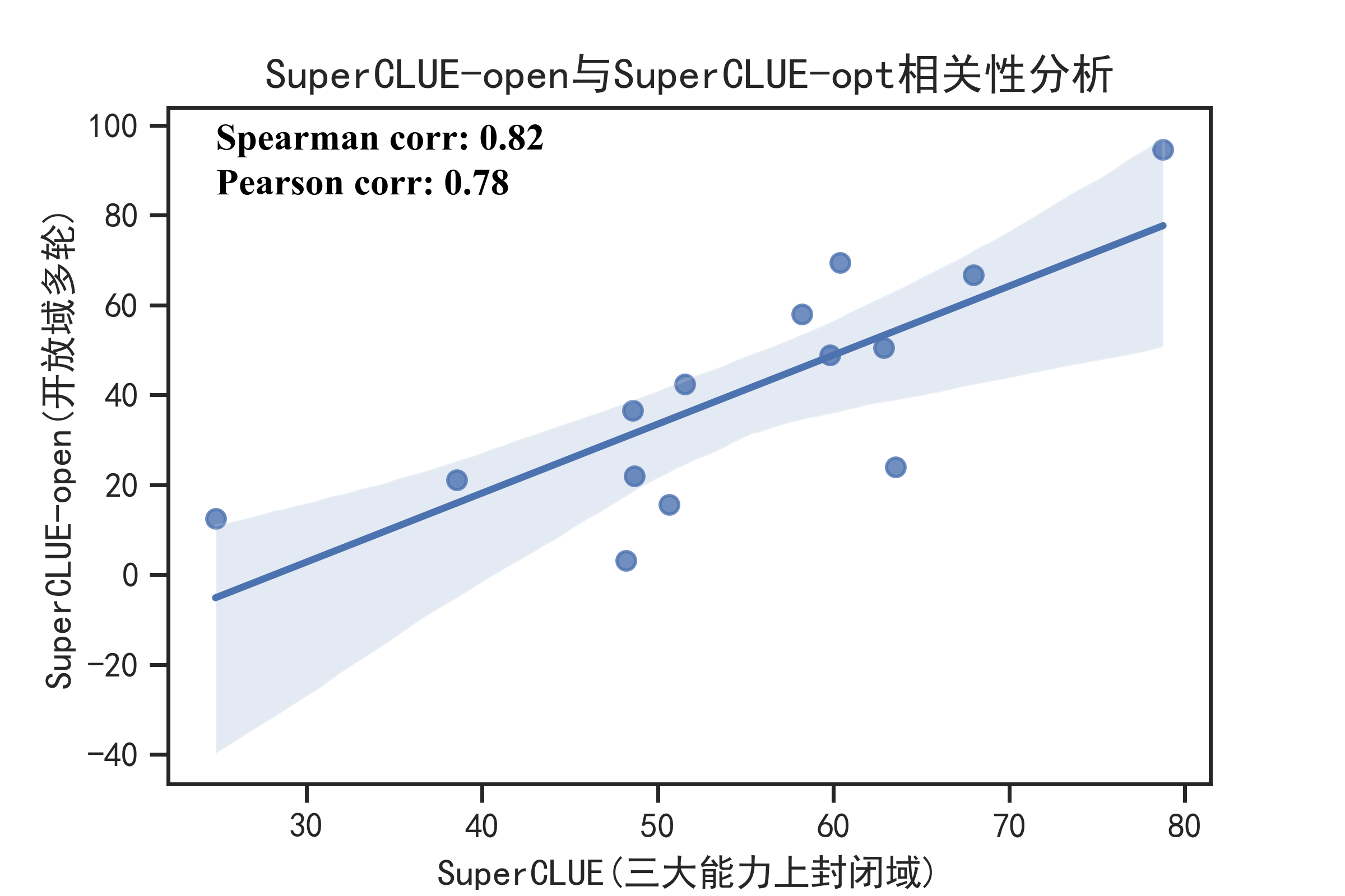 从相关性分析中可以看到,SuperCLUE-open与SuperCLUE-opt具有较高的一致性(Pearson/Spearman相关性系数0.78--0.82)